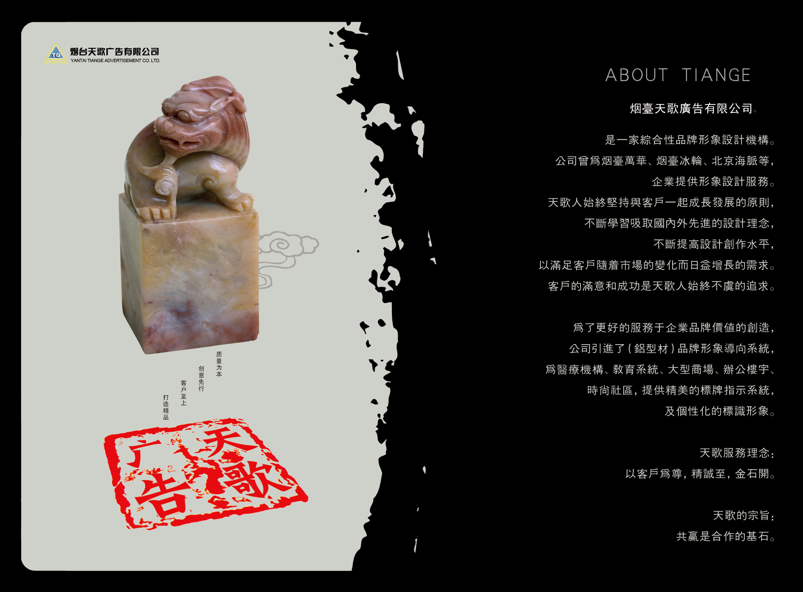 烟台天歌广告有限公司 以人为本,崇尚诚实守信。公司集创意策划人员、资深文案人员和信息广告人员为团队,坚持以规范化的运作模式,为企业提供整合行销传播的全程广告代理服务,为企业铺品牌之路、架世贸之桥。